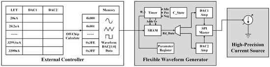 As shown in Figure 6, flexible waveforms based on the high-precision current source block can be generated after calibration. Firstly, the current amplitude and waveform type are chosen, such as sine, triangle, rectangle, etc. Second, a one-cycle sample of the desired waveform is taken with more sampling points for smaller distortion. Thirdly, the current values at each sampling point are transformed to a combination of and using the LUT, while the combinations should be stored in the memory. After the prototype has been powered on, the data in the memory are written to the static random access memory (SRAM) of the flexible waveform generator. Then, the timer generates the address and enables signals to read the configuration values, while the serial peripheral interface (SPI) master updates the current waveform by adjusting and . With these control functions, the prototype can perform flexible waveform configurations with high current precision.