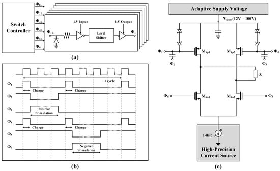 Figure 7c depicts the structure of the HV electrode switch matrix used in this work. The is provided by the adaptive supply voltage block, and the 14-bit stimulation current is controlled by the high-precision current source block. To control the HV CMOS switches, the voltage value of low-voltage (LV) digital control signals should be boosted by the level shifters.