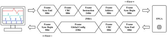 In the prototype, all digital circuits are implemented based on the FPGA, which receives instructions via a USB interface. Figure 8 illustrates the 8-byte instruction format, including a 1-byte synchronous start signal, a 1-byte address data, a 3-byte configuration data, a 1-byte check value, and a 1-byte synchronous finish signal. The receiver enable function is controlled by the synchronous start and finish signals, while the check value enables the FPGA to ascertain errors in transmission. The corresponding command location is determined by the 1-byte address data, and the instruction content is controlled by the 3-byte configuration data. To properly control the prototype, external devices must follow the specific command formats.