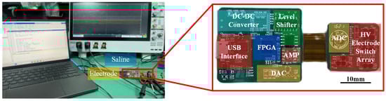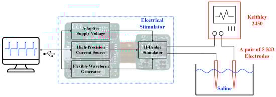 Figure 9 shows the measurement setup of the designed prototype, which is connected to a laptop via a USB interface and controlled by a Matlab program. The output of the prototype is connected to an electrode array to perform electrical stimulation. The electrical stimulator was verified through a series of bench-top testings, including a circuit measurement and performance verification in saline.