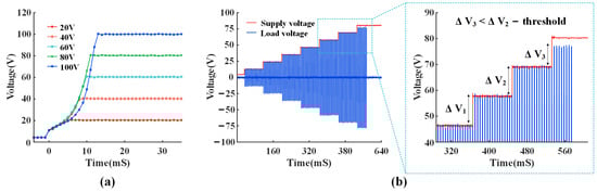 This prototype provides two approaches to adjust the HV supply voltage . Figure 10a shows the measurement results of setting directly, while the adaptive supply voltage block can generate an output voltage from 12 V to 100 V. Five typical amplitudes of (20 V, 40 V, 60 V, 80 V, and 100 V) are shown with a step of 20 V. The boost time depends on the desired supply voltage, and the maximum value is 12 mS. Figure 10b presents the measured with the over-voltage detection algorithm. To relieve the discomfort caused by the rapid rise of the in the electrical stimulator, the algorithm is designed to increase step by step. An 12-bit ADC is used to monitor to check whether it enters the over-voltage phase when rises gradually. At the time of 580 mS, a much smaller increase in is detected, which means the current is the desired supply voltage. Therefore, the over-voltage detection algorithm remains unchanged as and exits the adaptive adjustment process. If the load is small, a stimulation voltage of 12 V is sufficient to drive the stimulation current. Compared to a fixed supply voltage of 100 V, the stimulation power can be lowered by 88%. With this technique, a wide-range adaptive supply voltage can be achieved without external intervention, thus significantly increasing power efficiency.