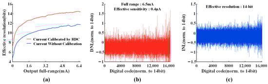 In this work, the resistance of and is chosen to be 3.6 K. Under ideal conditions, the maximum output current of and is 812.5 A, while the maximum stimulation current reaches 6.5 mA. Figure 11a shows the measured results of the effective resolution, which are defined based on the “Shannon entropy” []. Before calibration, the current source is generated by two DACs and influenced by and leakage, which will result in significant nonlinearity and lead to a substantial reduction in the current accuracy. After calibration, the proposed RDC technique improves the current resolution by 2 bits, which is consistent with the theoretical analysis. Figure 11b,c illustrate the measured differential nonlinearity (DNL) and integral nonlinearity (INL) of one stimulation channel with RDC. Both the X-axis and Y-axis are normalized to the targeted resolution of 14 bits. The designed prototype achieves a resolution of 14 bits with a full range of 6.5 mA and a sensitivity of 0.4 A. Due to the limited redundant combinations, the INL and DNL increase locally in higher digital codes, but the overall current accuracy is not affected.