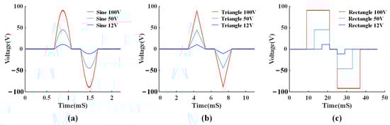 Figure 12 shows the measured flexible stimulation waveforms, including sinusoidal, triangular, and rectangular waveforms with a time precision of 1.6 S, 5 S, and 20 S, respectively. The desired voltage amplitudes of 12 V, 50 V, and 100 V can be obtained by adjusting the .