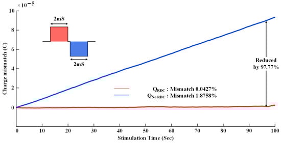 The blue curve in Figure 14 gives a charge balance-testing result without any calibration. The current mismatch between anodic and cathodic pulses is 1.8758%, and the residual average DC current is 937.9 nA. The red curve in Figure 14 shows the charge balance performance calibrated by RDC. The current mismatch drops to 0.0427%, and the residual average DC current decreases to 21.35 nA. Through the comparison of the measured charge balance performance before and after calibration, it is shown that 97.77% of the residual charge is eliminated by the proposed RDC algorithm. The designed prototype is supposed to be a safer electrical stimulator structure for long-term stimulation, which is suitable for both implantable and wearable devices.