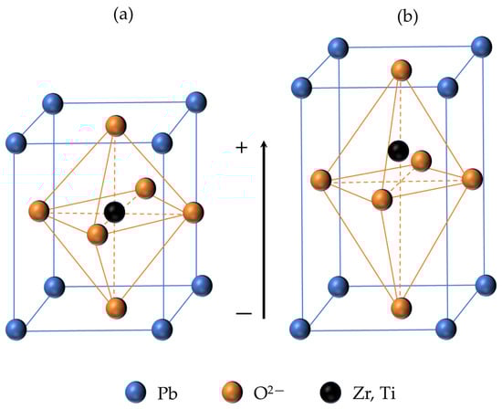 The elementary cell at temperatures above the critical one (Curie temperature []) has a cubic crystal lattice. If the temperature is below Curie temperature, then the elementary cell is distorted tetragonally towards one of the edges. As a result, the distances between positively and negatively charged ions also change (Figure 1). The displacement of ions from their original position leads to a separation of the centers of gravity of the charges within the cell, so that an electric dipole moment is formed. According to the energy conditions, the dipoles of neighboring elementary cells of the crystal are ordered by regions in the same direction, forming the so-called domains.