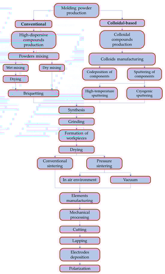 The manufacturing of piezomaterials could be exploited two widely known ways: conventional [] and colloidal-based techniques []. The main goal of both techniques is to obtain a homogeneous mixture of initial components—oxides or metals (Pb, Zr, Ti, etc.)