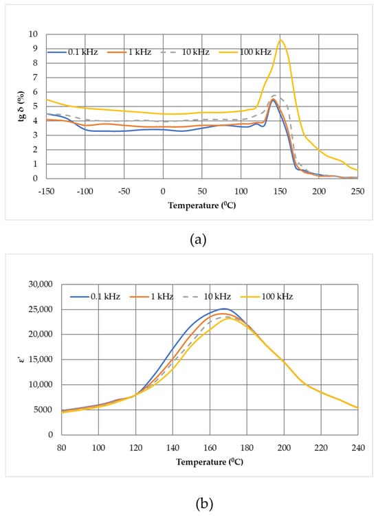 In the frequency range under consideration, a local temperature shift is clearly observed, where a maximum of the permittivity (Tm) is observed as the frequency changes (Figure 3a), which is explicitly characteristic of relaxor ferroelectrics. In addition, the appearance of the dispression effect is observed (situation when curves start to split at the various frequencies) at a temperature significantly below Tm. The maximum dispression of the permittivity is observed at a temperature of about 130 °C. It should also be noted that the maximum of the dielectric loss tangent tgδ (T) has an asymmetric form at different temperatures (Figure 3b), which is also a distinctive feature of ferroelectric materials with a diffuse phase transition [].