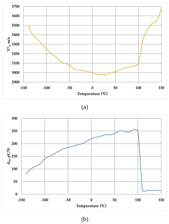 Temperature dependence of the longitudinal ultrasonic waves velocity VE1 (T) (a) and piezomodulus d31 (T) (b) of the developed material.