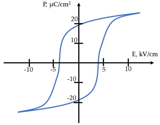 The behavior of the polarization of the resulting material was also studied depending on the applied external field. Figure 5 shows the dielectric hysteresis loop of the material under study, from which the value of the coercive field EC ≈ 4 kV/cm was determined. The hysteresis loop is saturated and close in shape to the loop characteristic of ferrosoft ceramics.