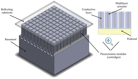First of all, it is worth mentioning the principle of operation of the piezostack deformable mirror with modular design. In fact, this mirror is one of the modifications of a piezoactuator deformable mirror and consists of a relatively thin reflective plate, under which there are modules (cartridges) with individual multilayer piezoelectric stacks, assembled on a single pedestal and glued at one end to the rear side of the passive substrate, others—to a thick basement (Figure 6). Due to the inverse piezoelectric effect, when a control voltage is applied, the length of the piezostack changes. Since the piezoelectric actuator is rigidly fixed on the back side of the substrate, its elongation causes local deformation of the reflecting surface. By applying a set of different voltages to such control elements, it is possible to form a desirable arbitrary shape of the surface of a deformable mirror.