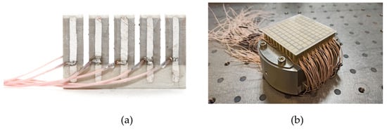 Each actuator of the resulting module was covered with a layer of silver-containing paste (burning method) in order to switch the electrodes of the active layers. Then, an SiF wire 0.4 mm thick was soldered to each current lead (Figure 8a).