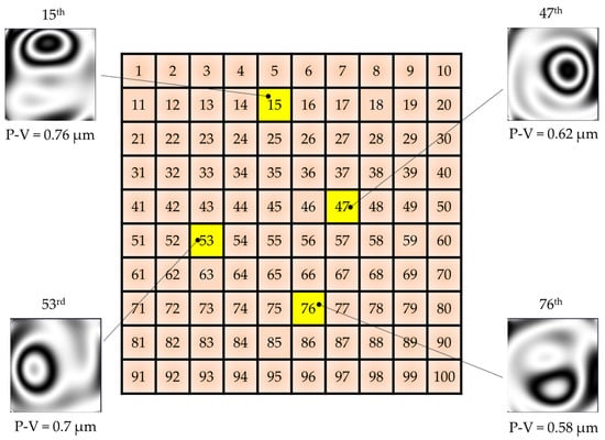 To measure the response functions of the control elements of the developed deformable mirror, the diagnostic setup based on the Shack–Hartmann wavefront sensor was used. The images of the mirror surface after applying the voltage of 300 V to different actuators are presented in Figure 9. As it could be seen from the presented data, the main surface deformation is of course concentrated in the range of the position of the actuators. At the same time, on the neighbor actuators one can also see the change in the mirror surface. This is due to the small (only 1 mm) distance between the actuators and also rather high thickness of the reflecting substrate (1.5 mm). In our case, the coupling coefficient was in the range of 60%. In addition, we expected the local stroke of the developed deformable mirror actuators be close to two microns, however, the measured data showed that the real local mirror displacement was just about one micron. Since the thickness of the individual layer of the actuator is 500 μm, the control voltages could be increased up to 600 V (−200…+400 V) for the manufactured piezoceramic modules. Thus, the stroke should be close to the expected 2 μm.