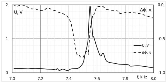 In addition, the first resonant frequency of the mirror was measured (Figure 10) by measuring amplitude-frequency and phased-frequency responses of the mirror. To measure the real value of this parameter we used the oscilloscope Tektronix DPO-2004B and a sine wave generator. The sine voltage with the frequency range from 0.1 to 8 kHz was applied to the actuator #45 (it could be applied to any piezostack). Due to the piezoelectric effect, AC voltage was detected on the neighbor electrode #46 and was registered using the oscilloscope. The amplitude of the output signal was stable up to the frequency of 7.4 kHz, and the first resonance was found at the frequency of 7.5 kHz. Additionally, the temporal bandwidth of the deformable mirror could be described using the Bode Curve [], which shows the use of such corrector in an adaptive optical system with frequency up to 7.4 kHz.