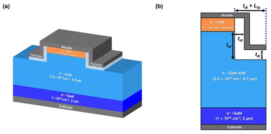 Figure 1a illustrates the cross-sectional schematic of a vertical GaN PN diode with a trench MIS FP. The epitaxial structure consists of a highly doped p-type layer, a low-doped n-type drift layer, and a highly doped n-type contact layer. The doping concentration and thickness of the n-type drift layer must be designed to achieve a target breakdown voltage. In this study, a target breakdown voltage of >1 kV was used as an example. The doping concentration and thickness of the bottom N+ contact layer were set to be 1 × 1019 cm−3 and 2 µm, respectively. It is important to note that the thickness of the bottom contact layer does not significantly affect the breakdown voltage unless it is extremely thin.