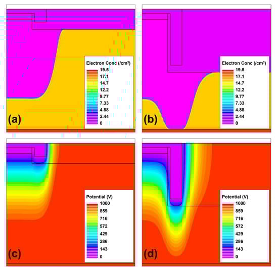 The punch-through phenomenon under the trenched MIS FP region must be avoided until breakdown occurs in the active PN diode region. As illustrated in Figure 2, the punch-through phenomenon can be influenced through the design of the trenched MIS structure. Properly designed trenched MIS FP structures exhibit a depletion region under the trenched MIS region that does not exceed that in the active PN region, as shown in Figure 2a,c. Conversely, when the depletion region under the trenched MIS FP is deeper than that in the active PN region, the device breakdown is caused by the punch-through phenomenon under the trenched region, as shown in Figure 2b,d. Therefore, to maximize the breakdown voltage, it is essential to avoid the punch-through phenomenon under the trenched MIS region, leading to the following boundary condition: “The surface potential under the trenched MIS FP region must not exceed the potential at the same depth in the PN active region”.