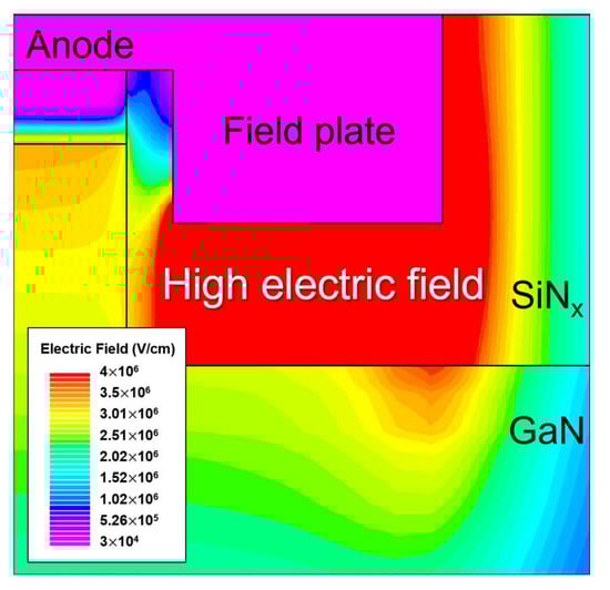 The second boundary condition is as follows: “The electric field at the trenched surface under the MIS FP edge must be lower than the critical electric field of GaN with a sufficient safety margin”. As depicted in Figure 3, the highest electric field in the drift region under the trenched MIS FP occurs at the location under the MIS FP edge due to edge effects [,,,,]. This enhanced electric field must not cause avalanche breakdown before breakdown occurs in the active PN region. Consequently, the electric field at the corner must be lower than the critical electric field of GaN, with an appropriate design margin. The electric field at the corner can be calculated using the image charge method [].