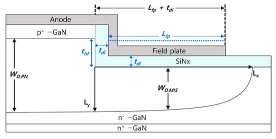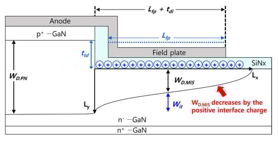 The electric field at the FP edge can be calculated using the image charge method with a uniform sheet surface charge of the FP. The electric field crowding at the semiconductor surface below the MIS FP edge depends on structural variables such as the horizontal length of the field plate (), , and . The electric field components in the x-axis and y-axis directions are given by [,]: