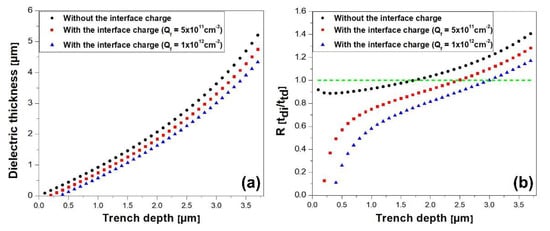 Figure 6a illustrates the minimum required dielectric thickness versus trench depth as a function of the interface charge density, varied by 0, 5 × 1011, and 1 × 1012 cm−2. Figure 6b shows the ratio between the dielectric layer thickness and trench depth, where the maximum limitation (/ = 1) is indicated as a boundary condition.