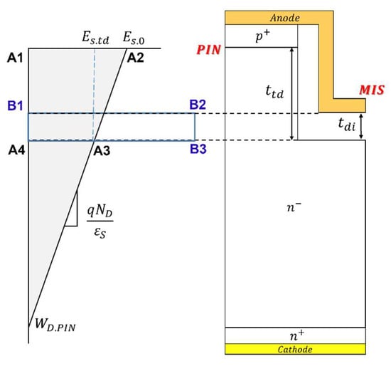 When the trench MIS is properly designed without punch-through under the trench MIS FP, the surface potential at the trenched region must be equal to that at the same depth from the PN junction inside the active region. In such a case, the electric field inside the MIS region depends on the dielectric layer thickness. Figure 7 illustrates the electric field distribution under the PN junction in the active region and under the trenched MIS FP region. Since the same voltage is applied, the area of A1A2A3A4 is equal to the area of B1B2B3A4. Therefore, the maximum electric field in the MIS region () can be expressed as: