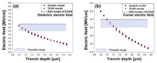 The TCAD simulations were conducted with various dimensions to validate the model. The trench depth was varied from 0.7 µm to 2.5 µm where the interface charge density was 1 × 1012 cm−2 and the minimum dielectric thickness was determined using Equation (13). Figure 8a shows a comparison between TCAD and the calculated maximum electric field at the trenched GaN surface below the MIS FP edge versus where was the minimum dielectric layer thickness needed for , obtained using Equation (13). The difference between TCAD and the calculation was not significant. The boundary condition for the critical electric field of GaN must be considered to determine the safe margin of . In this study, the maximum allowed electric field for GaN was set to be 4 MV/cm as an example.