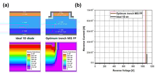 (a) Structures and electric field distributions of an ideal 1D vertical PN diode and a vertical PN diode with a proposed trench MIS FP, and (b) breakdown characteristics obtained using the proposed trench MIS FP in comparison with an ideal 1D diode structure. The electric field distributions were simulated at a reverse bias voltage of 1080 V.