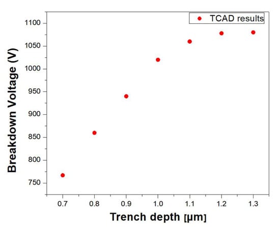 Breakdown voltage versus trench depth () obtained using TCAD simulation.