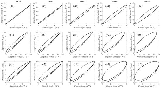 The measured input–output relationships of the VA-PEA module actuated by sinusoidal signals at 100 Hz, 200 Hz, 400 Hz, 800 Hz, and 1000 Hz. (a1–a5) the u→U relationships, (b1–b5) the U→d relationships, and (c1–c5) the u→d relationships.