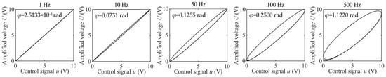 Without loss of generality, the following values are adopted: k = 1, ωn = 5000 rad/s, and ζ = 1. The control signal is assumed to be a sinusoidal signal with an amplitude of 10 V. Figure 3 shows the input–output curves of this linear system at different frequencies. It can be observed that hysteresis-like loops also exist for this linear system. At low frequencies, e.g., 1 Hz, the phase lag φ is negligible and the hysteresis loop is not obvious. However, with an increment in frequency, the phase lag increases and the hysteresis loop becomes very wide. The results in Figure 3 are similar to the results in Figure 2(a1–a5). This implies that the VA’s dynamics can be well captured using a simple transfer function.