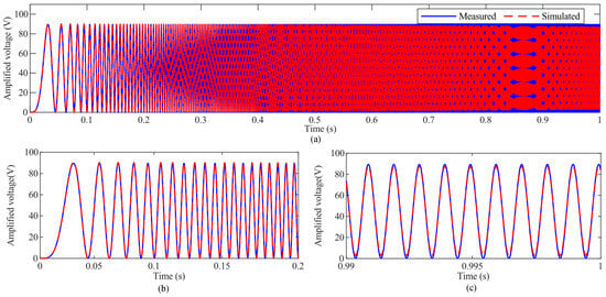 Measured and estimated amplified voltages of the VA: (a) the overall results, (b,c) the zoomed-in details from 0 to 0.2 s and from 0.99 to 1.0 s, respectively.