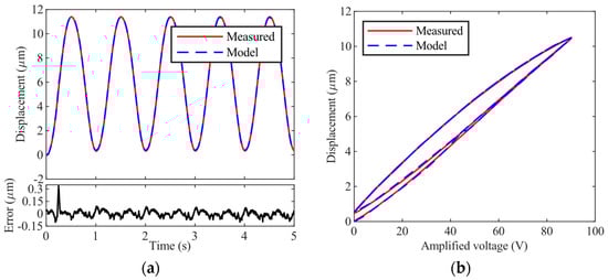 The modified PI model MPI(W) is identified first. Because MPI(W) is defined as a rate-independent model, measurements under the actuation of a 1 Hz sinusoidal signal are used in identification. In this case, the rate dependence can be ignored, i.e., GPEA(s) can be simplified to be 1. Based on previous experience, both the orders of the PI model and the polynomial operator are set to be 10. The parameter identification results are listed in Table 1. The measured displacement and model output are shown in Figure 5.