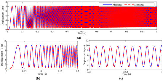 Measured and estimated displacement of the PEA: (a) the overall results, (b,c) the zoomed-in details from 0 to 0.2 s and from 0.99 to 1.0 s, respectively.