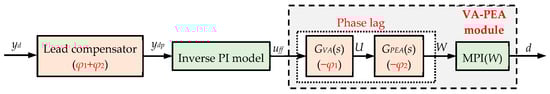 Based on our preliminary tests, at higher frequencies, the influences of GVA(s) and GPEA(s) mainly come from their phase lags. Therefore, this paper proposes a phase–hysteresis hybrid compensation strategy. As shown in Figure 7, a lead compensator is used to add a phase lead to the desired trajectory yd, thus compensating for the phase lags of GVA(s) and GPEA(s). Subsequently, an inverse PI model is used to compensate for the hysteresis of the PEA. In this phase–hysteresis hybrid compensation, the displacement d can follow the desired trajectory yd.