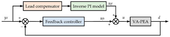 As graphically illustrated in Figure 1b, the VA-PEA module can be treated as the integration of linear and nonlinear parts. Based on the hysteresis–dynamics hybrid modeling results in Section 2, a high modeling accuracy has been achieved across the frequency range of 0~1000 Hz. Therefore, one straightforward hysteresis compensation strategy is to cascade the inversion of the hysteresis–dynamics model to the VA-PEA module. In many conventional hysteresis compensation methods, only hysteresis compensation at relatively lower frequencies is pursued. In this case, the influence of the linear part is not very obvious, and thus only the nonlinear part of the system is considered. However, the hysteresis compensation performance at higher frequencies is not satisfactory.
