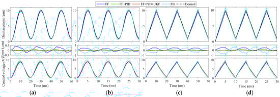 Hysteresis compensation performances and control voltage u of signals at high frequencies. (a) 500 Hz sinusoidal trajectory; (b) 1000 Hz sinusoidal trajectory; (c) 500 Hz triangular trajectory; and (d) 1000 Hz triangular trajectory.