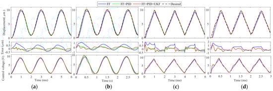 (2) High-frequency tracking: The frequency of the desired trajectory is increased to 500 Hz and 1000 Hz so as to test the high-frequency performance of the proposed FF + PID + UKF. The experimental results are provided in Figure 10. Similar to the results in Figure 9, in high-frequency experiments, the feedforward compensation is also very good. After adding a feedback controller, the tracking error can be further reduced. The proposed FF + PID + UKF achieves the best performance among the controllers. However, it is found that it is very difficult to tune the gains of the PID in FB. As a result, FB is not included in Figure 10.