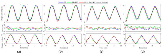 For the hysteresis compensation, the relationships between the desired and actual trajectories of the compensated system in tracking sinusoidal trajectories are obtained and presented in Figure 12. A 45° line is also plotted in each figure to indicate the unitary mapping from the desired trajectory to the actual trajectory. The closer to the 45° line, the better hysteresis compensation performance. At frequencies below 500 Hz, the desired–actual curves of the proposed FF + PID + UKF almost coincide with the 45° line, showing excellent hysteresis compensation performance. For frequencies higher than 500 Hz, the desired–actual curves of the proposed FF + PID + UKF also stay the closest to the 45° line when compared with the other methods. The experimental results in tracking triangular trajectories are similar and thus will not be presented.