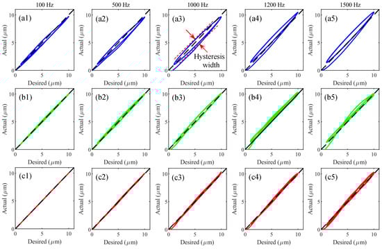 In order to quantitatively assess the hysteresis compensation performance, the hysteresis width of the closed-loop system is proposed. As shown in Figure 12a3 for the closed-loop system, the 45° line indicates the unitary mapping from between the desired and actual trajectories. As a result, the width of the input–output curve perpendicular to the 45° line is defined as the hysteresis width. This index is reasonable for hysteresis compensation as the hysteresis width will converge to zero if the hysteresis is successfully compensated for. The hysteresis widths of the closed-loop system using different controllers are listed in Table 4.
