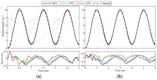 Trajectory tracking performances of the proposed method at environment temperatures of 25 °C, 35 °C, and 50 °C. (a,b) 500 Hz and 1000 Hz sinusoidal trajectories.