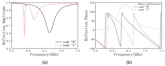(a) The x-polarized reflected electrical field intensity and (b) the reflected phase of the metasurface when the unit cell is uniformly coded at “0” (black solid line) or “1” state (red dash line), and the phase difference between the two states (blue dot line).