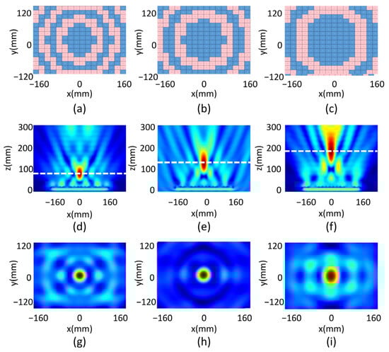 The code distribution for the beam focusing function of designed focal length at (a) 50 mm, (b) 100 mm and (c) 150 mm; the calculated electrical field intensity distribution of the reflected microwave in the xz plane for the designed focal length at (d) 50 mm, (e) 100 mm and (f) 150 mm; the reflected electrical field in the xy plane for the designed focal length at (g) 50 mm, (h) 100 mm and (i) 150 mm.