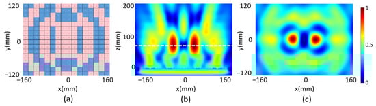 (a) Code distribution of the programmable metasurface with double focus; (b) reflected electrical field intensity in the xz plane and (c) reflected electrical field intensity in the focal plane.