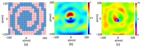 We finally investigate a focused one-order vortex beam through the programmable metasurface, which requires a reflected phase distribution on the metasurface according to the Equation (4). By setting Fx = Fy = 0, Fz = 70 mm and l = 1, we obtain the unit cell phase distribution which is then digitized as shown in Figure 5a. The reflected electrical field intensity and phase in xy plane are both calculated at z = 70 mm as shown in Figure 5b,c, correspondingly. The electrical field intensity is zero at the center, and the reflected phase distribution manifests a spiral behavior, indicating a vortex beam is generated. As a conclusion, the multi-functional metasurface is numerically demonstrated by programming the metasurface for beam shaping of the microwave into a single-focus beam, a double-focus beam and a focused vortex beam.