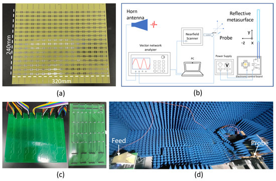 The programmable metasurface was fabricated for experimental investigation of the multi-functional beam shaping on the microwave, which consists of 16 × 16-unit cells as shown in Figure 6a. The metasurface substrate is made of 1.1 mm thick FR-4 layer coated with a thin polypropylene layer on the top and a copper layer at the bottom. The unit cell structure is the same as describe above, in which a varactor diode (SMV2020-079L) is integrated. Two pins of the varactor diode are connected to the strip lines at the backside of the metasurface. The strip lines of all unit cells are connected to a control circuit consisting of four decoders (CD74HC238EG4) and one microcontroller (STM32) as shown in Figure 6b, which is used to electrically bias each varactor diode independently. The switching time for reprogramming the metasurface mainly depends on the control circuit and is estimated within 1 μs. The bias is either 0 V or 20 V to code the corresponding unit cell as “0” or “1” condition. The experimental setup for scanning the reflected wave intensity is illustrated in Figure 6c, which was in an anechoic chamber to eliminate the microwave reflected from the environment. One port of the vector network analyzer (Keysight, N5225A) was connected a horn antenna to emit a microwave with linear polarization. The polarization direction can be changed by simply rotating the horn antenna. The metasurface sample holder was placed about 2.5 m away from the horn antenna and the microwave was normally incident on the metasurface. An electrical field probe connected to an electrical field scanner (Linbou Nearfield Technology, Shenzhen, China) was used to scan the electrical field. The electrical probe behaves as a dipole antenna, and the instant electrical current induced by the time-varying electrical field of the EM wave was recorded by the electrical field scanner, which is synchronized with the signal emitted from the vector network analyzer. Therefore, both the intensity and phase in front of the metasurface can be obtained. The step size of the scanning was set at 6 mm, which is eight times smaller than the targeted wavelength and is therefore fine enough for characterizing the electrical field distribution.