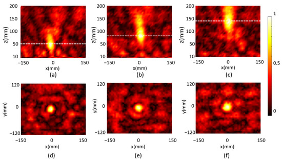 The measured reflected electrical field intensity in the xz plane and in the xy plane for the designed focal length of (a,d) 50 mm; (b,e) 100 mm and (c,f) 150 mm, correspondingly.