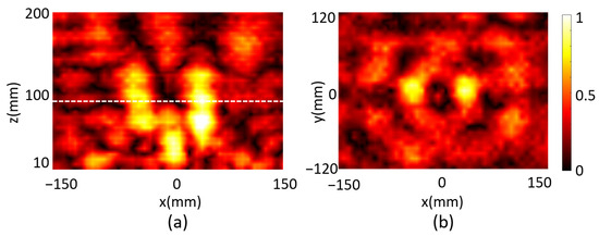 The beam with double focus is realized through the programmable metasurface by setting N = 2 in Equation (2). Assuming Fx1 = −40 mm, Fy1 = 0 and Fz1 = 100 mm for Focus 1, and Fx2 = 40 mm, Fy2 = 0 and Fz2 = 100 mm for Focus 2, and setting the electric field intensity weight = 1 for both foci, we obtain the required phase distribution on the metasurface from Equation (2), which is then digitized according to Equation (5) and as shown in Figure 4a. The reflected electrical field intensity in the xz plane at y = 0 is plotted in Figure 4b, and two focal spots are observed. The corresponding focal lengths in the z directions Fz1 and Fz2 are both 74 mm when measuring the distance of the two focal spots with maximum electrical field to the metasurface. The measured focal lengths deviate from the designed values, which should be also due to the phase error caused by the digitization and the inequality of the reflected intensity between the “0”- and “1”-coded unit cells mentioned earlier. The focal plane is plotted in Figure 4c, which manifests two identical focal spots with FHWMx = 42 and FHWMy = 46 mm. The sizes of the two focal spots are comparable with the incident wavelength. It is worth pointing out that the focal spots with different intensity can also be realized by simply setting different electric field intensity weights for different spots, which is not discussed here.