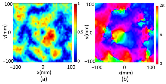 Next, we scanned the reflected electrical field of the metasurface programmed for double-focus beam shaping. Two focal spots were observed on the xz plane for the microwave at f = 5.7 GHz as shown in Figure 8a, which is about 80 mm in front of the metasurface. The electrical field on the xy plane with z = 80 mm was then scanned and the reflected electrical field intensity was plotted in Figure 8b. It was measured that FWHMx1 = 39 mm and FWHMy1 = 50 mm for one spot and FWHMx2 = 39 mm and FWHMy2 = 56 mm for the other, which demonstrated the two spots are almost identical. We finally programmed the metasurface with code distribution as shown in Figure 5a for focal vortex beam generation. The reflected field intensity and the phase of the microwave were scanned and plotted in Figure 9a,b, respectively, at 68 mm above the metasurface, which manifests an obvious one-order vortex beam pattern. A point with zero intensity was measured at the center of the area, and the spiral phase distribution further confirms the vortex beam generation.