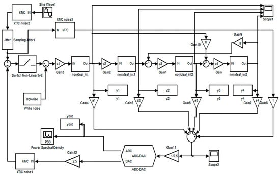 According to the requirements of the system specifications, we considered system stability, power consumption, complexity, etc., and the modulator structure is finally selected as a complete feedforward structure with the parameters set to OSR = 128, L = 4, and n = 3, which leaves a considerable design margin in this work. The system model of the modulator designed in this work is shown in Figure 1. Compared with the traditional fourth-stage feedforward structure, this structure uses local negative feedback and negative feedforward for optimizing the zero pole of the system, thus improving the system’s stability. A feedforward path is introduced at the output of the first stage. At the input of the modulator, the double sampling technique is used to double the equivalent sampling frequency and the signal bandwidth without increasing the circuit’s power consumption. The modulator uses a 3-bit quantization structure, so the fully differential topology reduces the nonlinearity introduced by the mismatch between the feedback capacitors. The charge amplifier is used in the local feedback, which can save chip area. The chopper technique is used in the first stage to reduce the 1/f noise of the modulator. The conventional analog adder is improved to calculate the quantized voltage value. In order to calculate the quantized voltage value, the conventional analog adder is modified to reduce the voltage difference between the two summations, thus reducing the swing rate. Modeling and simulating the behavior of a modulator can examine system stability, noise-shaping capability, and adaptability to parameter errors, guiding parameter optimization and circuit design. The diagram below depicts a behavioral-level model of a ΣΔ micro-accelerometer with non-ideal characteristics, including models for clock jitter, kT/C noise, operational amplifier thermal noise, limited bandwidth in the integrator’s operational amplifier, finite gain, and slew rate, among others. These non-ideal characteristic models can be installed and invoked in the Matlab Simulink toolbox or customized. Parameters within the modules must be reasonably optimized based on theoretical calculations and iterative simulations to ensure that the behavioral-level model closely simulates the performance of the actual circuit design.