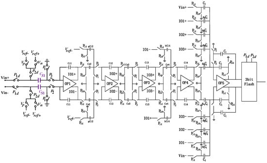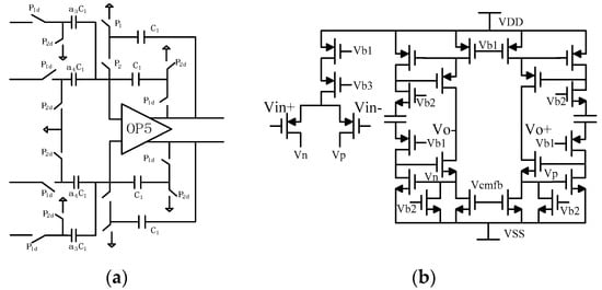 The sigma-delta modulation technique is widely used in analog-to-digital converters to convert analog signals to high-precision digital signals, generally used in applications requiring high accuracy but low speed []. The sigma-delta modulator is a crucial part of determining the ADCs conversion accuracy and affecting the entire system’s performance []. Previous researchers designed a discrete-time band-stop filter in the read-out circuit to eliminate the offset ripple []. However, the discrete-time switched capacitor filter will introduce noise aliasing and improve the noise power spectral density of the baseband. At the same time, this topology requires high chopping frequencies and ensures sufficient phase margin. This work proposes that the sigma-delta modulator can realize noise shaping effectively at a high oversampling ratio (OSR) with moderate speed, avoid noise aliasing, and increase power consumption. The sigma-delta circuit implemented with switched-capacitor topology has the advantages of a high signal-to-noise ratio, a large bandwidth, good linearity, and better compatibility with CMOS processes.