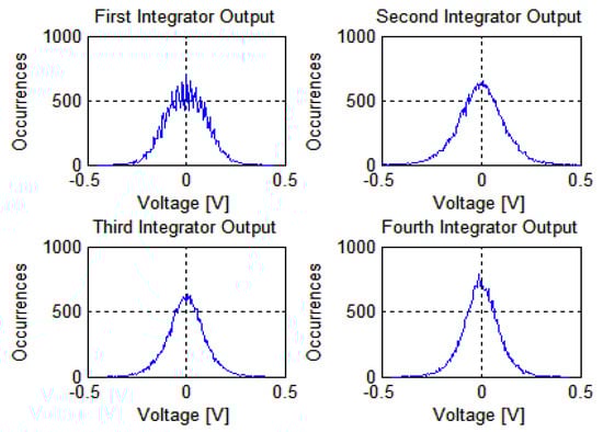 The overall circuit of the modulator is simulated with a clock frequency of 6.144 MHz, an input signal frequency of 25 kHz with an amplitude of −8 dBFs, and the transient simulation output waveforms of the integrators at each level are shown in Figure 4. Combining Figure 4, it can be observed that the output amplitude of the first-stage integrator is within ±0.4 V, the output amplitude of the second-stage integrator is within ±0.8 V, and the output amplitude of the third-stage integrator is within ±0.7 V. It can be seen from the figure that the output of each level integrator is stable, and the output swing is small.