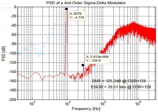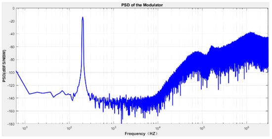 In the simulation environment of Cadence spectreVerilog, the quantizer’s output results are sampled at equal intervals, 65,536 points are captured for FFT analysis, and the PSD plot obtained by calculation and processing in Matlab is shown in Figure 5. The results show that the system realizes the noise shaping function, and the quantization noise at low frequencies is shaped to high frequencies. The signal bandwidth’s output noise level is about −140 dBV/Hz1/2. According to the reference voltage of ±2.5 V, the output noise voltage density in the signal band is 250 nV/Hz1/2. The signal-to-noise ratio can reach 125.2 dB, the effective bit count is about 20.51 bits, and the harmonic distortion is about −121 dB, which meets the requirements.
